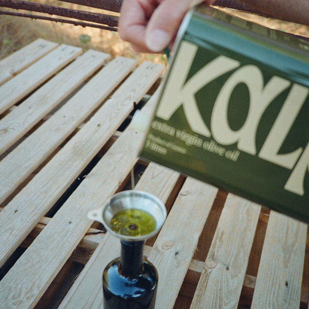 Remove the pourer and insert the funnel. Refill with Kalpáky’s extra virgin olive oil from the tin. Remove the funnel and re-insert the pourer.