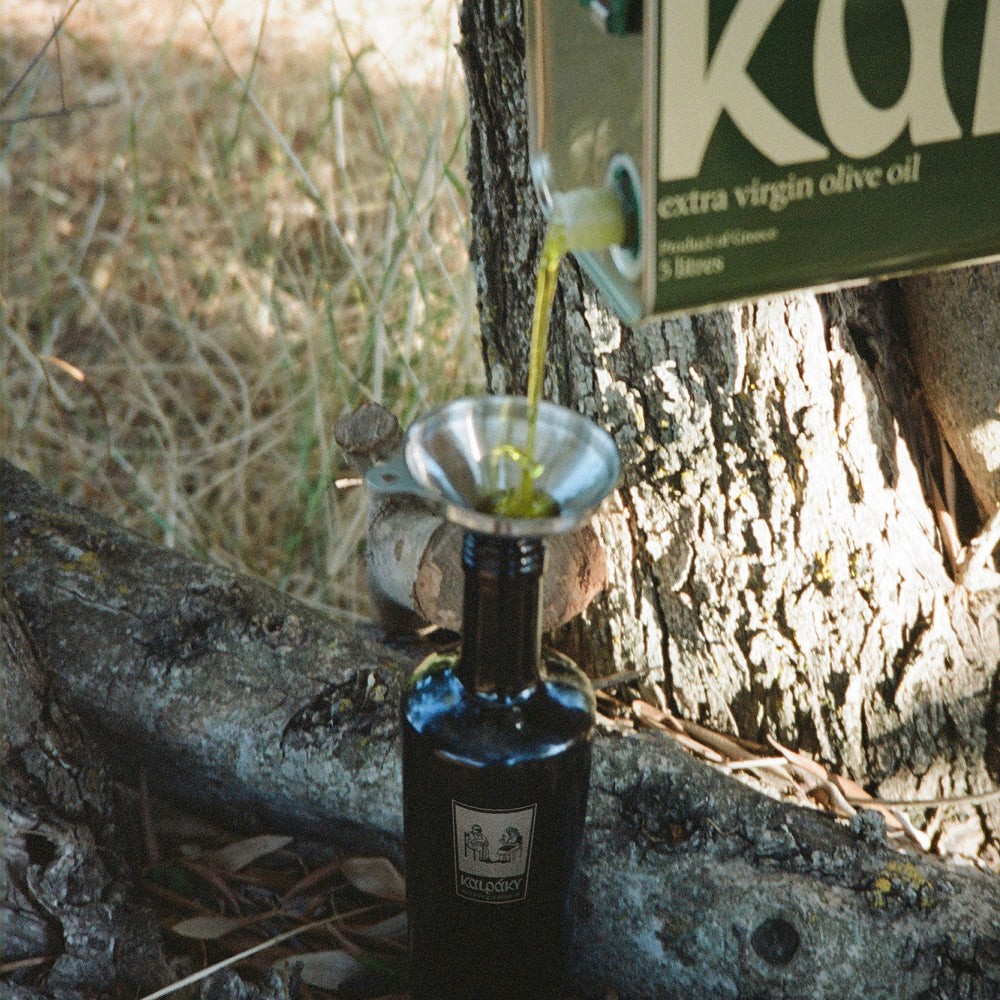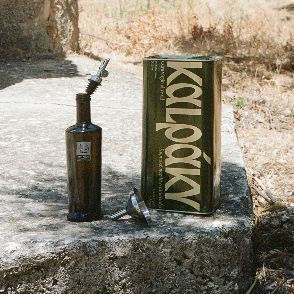 Remove the spout and insert the funnel. Refill with Kalpáky’s extra virgin olive oil from the tin. Remove the funnel and re-insert the spout.